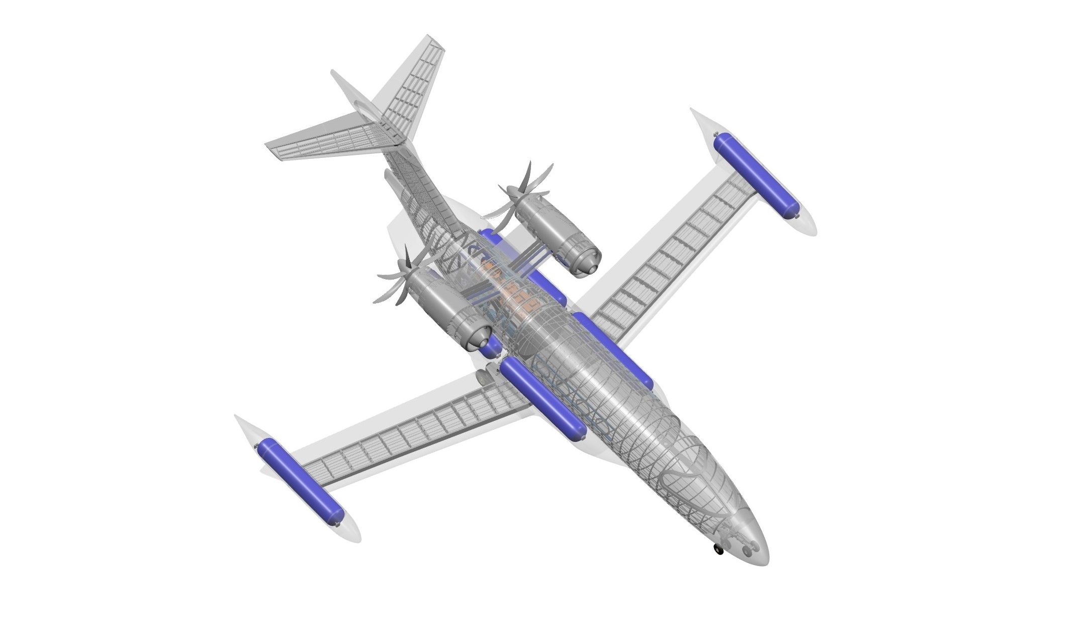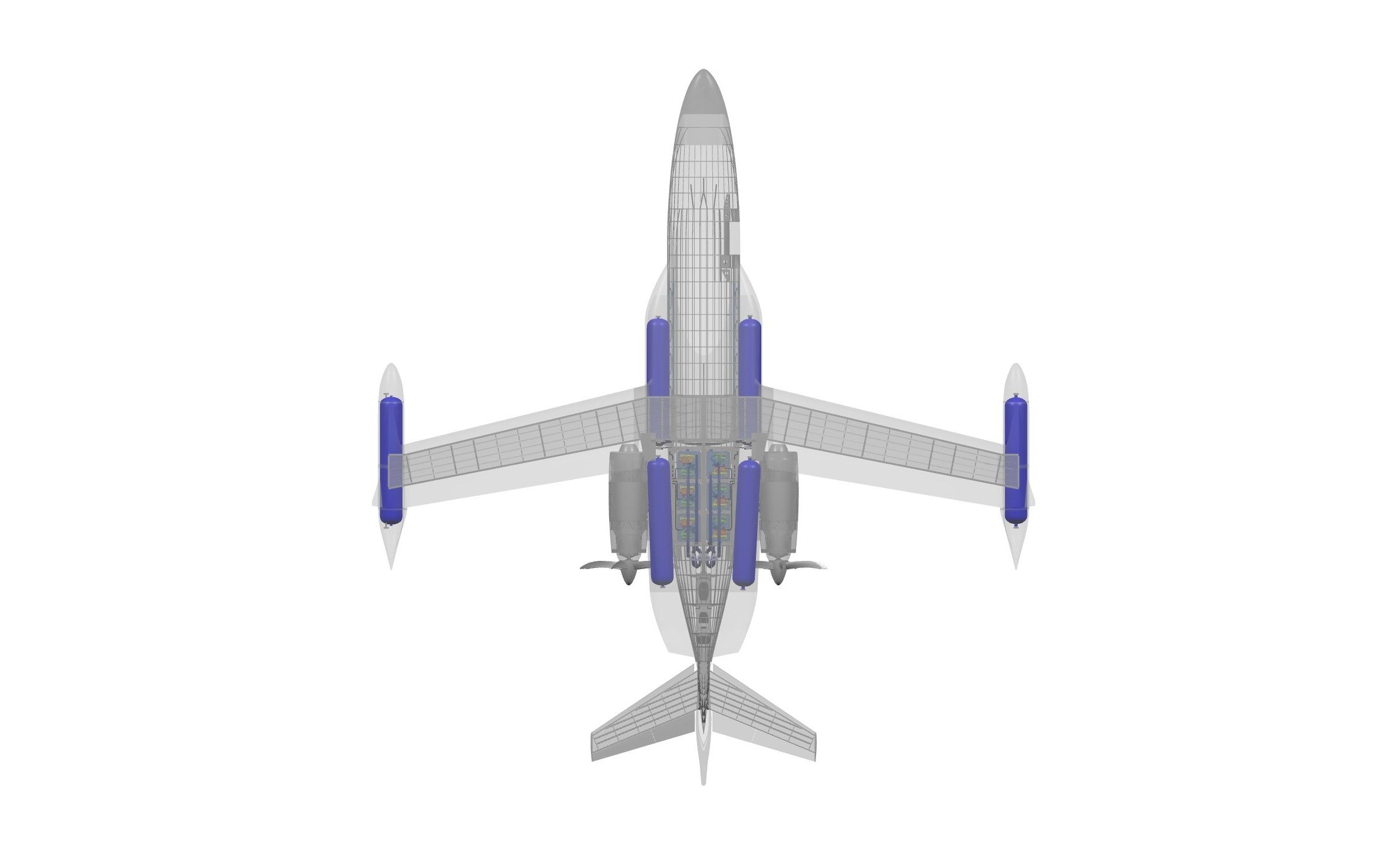 The BYA-I One uses a twin-propfan configuration powered by six 400kW fuel cells running on gaseous hydrogen (GH2) stored at 700 bar in externally mounted tanks above the wing structure. Total propeller shaft power is rated at 950kW.