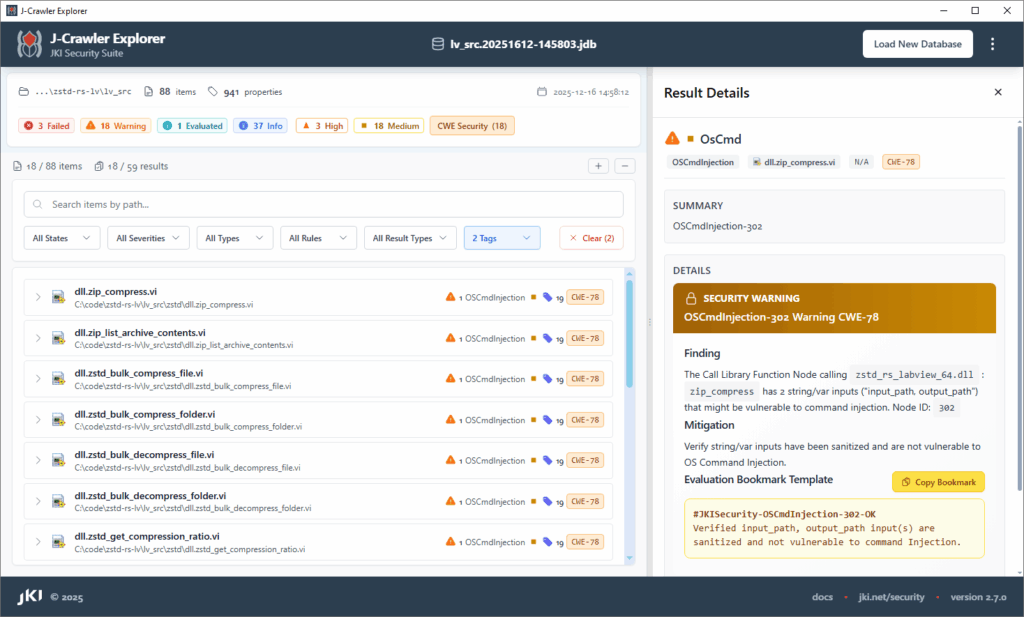 The JKI Security Suite includes a SAST tool that analyzes LabVIEW source code, classifies findings against the MITRE Common Weakness Enumeration (CWE) framework and provides remediation guidance.